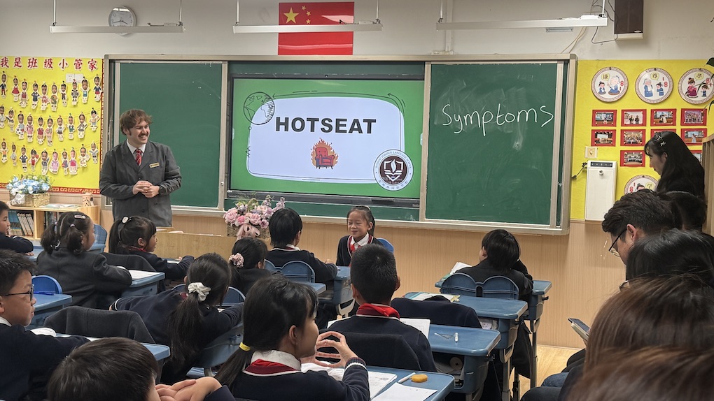 外教课上,老师以 “Healthcare” 为主题展开。课堂围绕疾病、发烧症状、相关建议等核心词汇,通过情景问答、互动交流引导学生掌握知识,还讲解了体温计使用及科学原理。