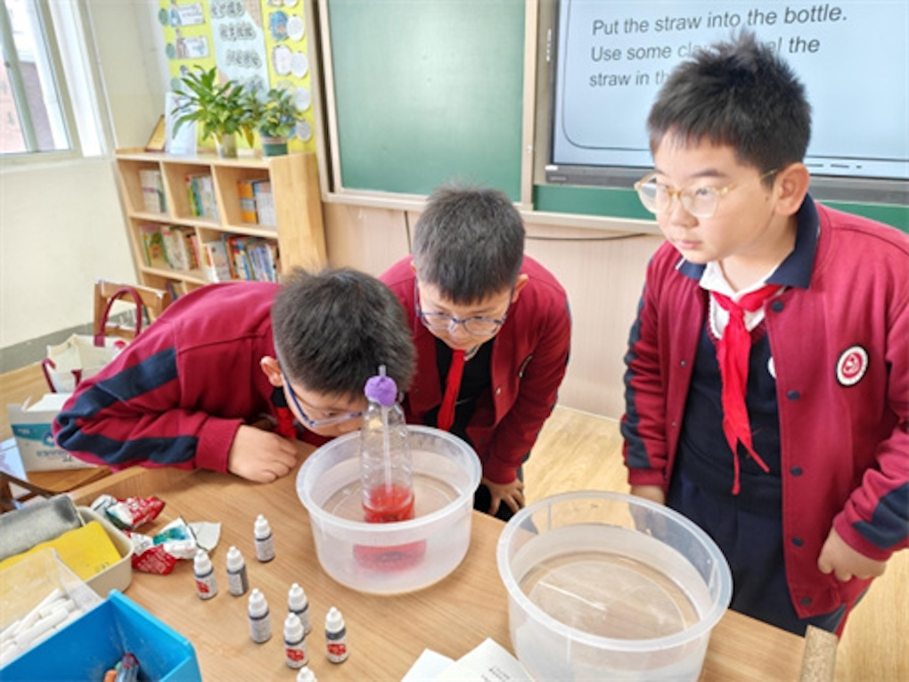当瓶子探进热水,红色液柱“嗖”地上升;移入冰水,它又缓缓下降。“Why?”Miss Gemma问。“The alcohol expands in hot water and contracts in cold water!”我们齐声回答。没有PPT,没有翻译,一个简单的瓶子实验让我们秒懂温度计的工作原理。