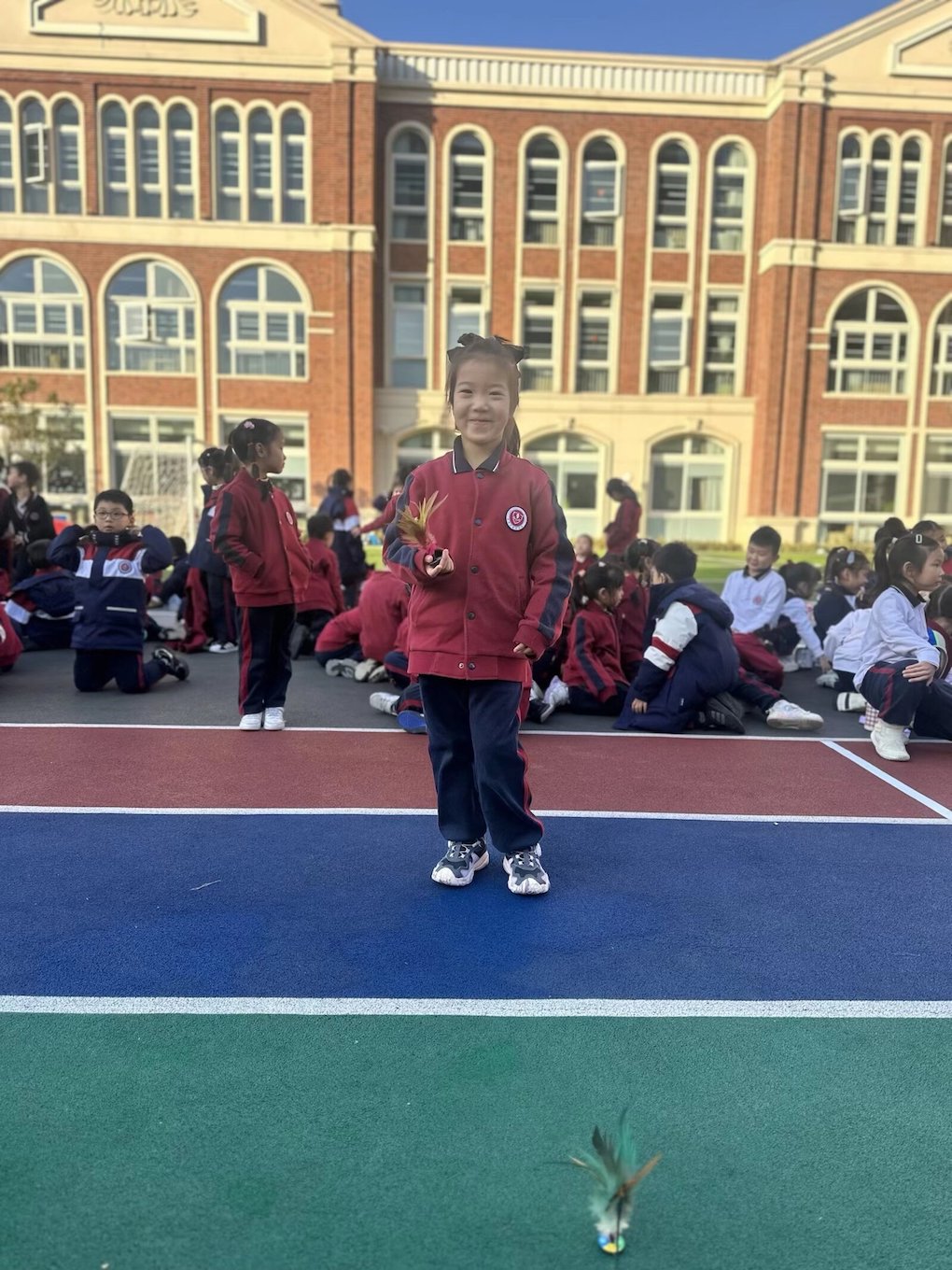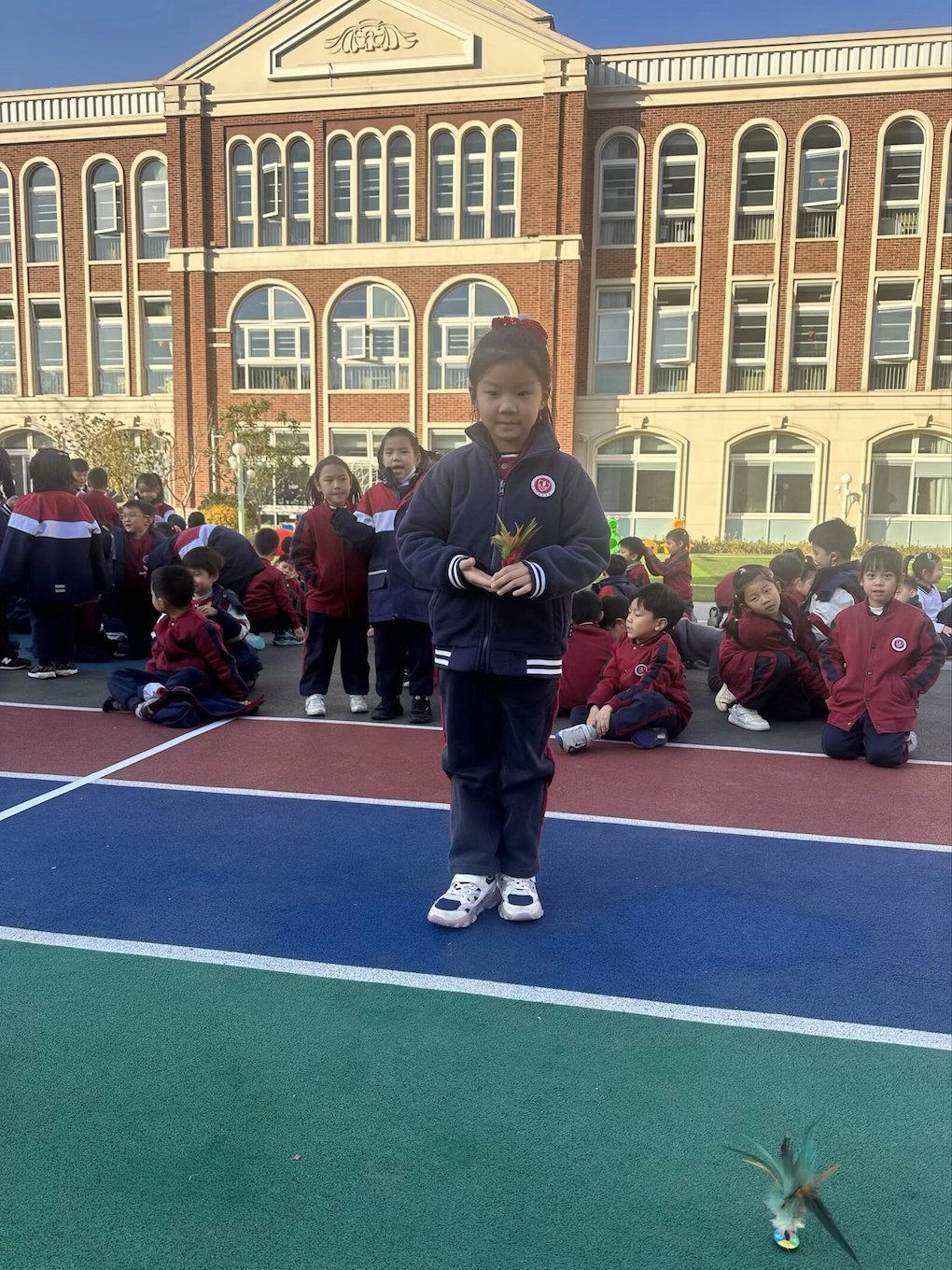 另一边的踢毽子场地同样热闹非凡。五彩的毽子在空中翻飞,像一只只灵动的蝴蝶。踢毽子对一年级的孩子来说是个不小的挑战。俞诗远一开始总是接不到毽子,但他没有气馁,一次又一次地尝试。当毽子终于在他的脚上时,他兴奋地跳了起来,脸上绽放出灿烂的笑容。