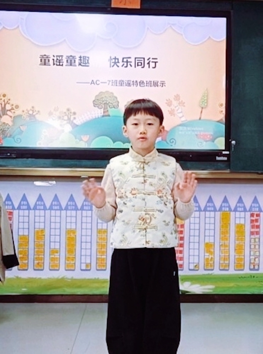 童谣是童年最动听的歌谣,也是传承文化的重要载体。作为童谣特色班,AC一7班将童谣学习融入日常教学的点点滴滴。每周,班级都会固定安排童谣学习时间,从经典的《过山车》《数字歌》,到充满生活气息的《小老鼠上灯台》,一首首朗朗上口的童谣,成为了孩子们课间最喜爱的“伙伴”。老师带着孩子们逐字逐句地诵读,指导他们把握童谣的节奏与韵律,孩子们则用清脆的嗓音,将童谣的趣味与美好传递到教室的每一个角落。