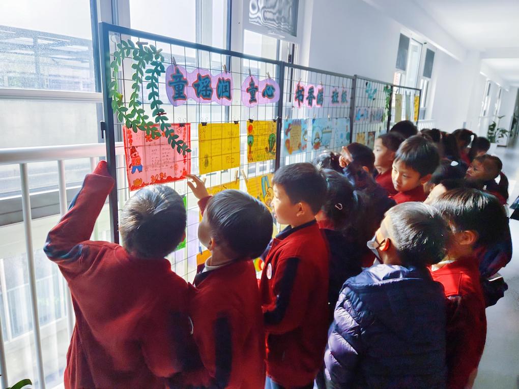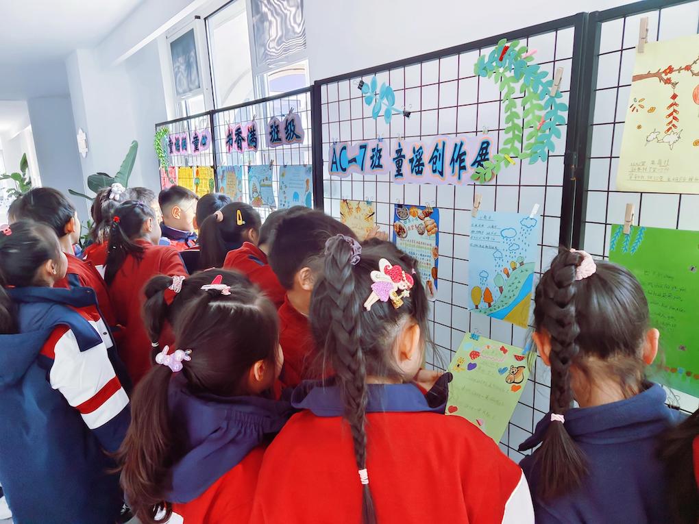 为了让孩子们的创作成果被看见、被肯定,班级特意举办了童谣创作作品展。老师统一发放彩纸,指导孩子们将自己的童谣作品以图文并茂的形式呈现。不会写的字就用拼音代替,再配上自己手绘的小插画——鲜艳的色彩、可爱的图案,与稚拙的文字相映成趣。这些作品整齐地陈列在班级走廊的展示区,吸引了师生驻足观看。孩子们牵着小伙伴的手,骄傲地指着自己的作品介绍:“这是我写的童谣!”这场作品展,不仅增强了孩子们的创作动力,更让他们在收获成就感的同时,坚定了继续创作的信心。