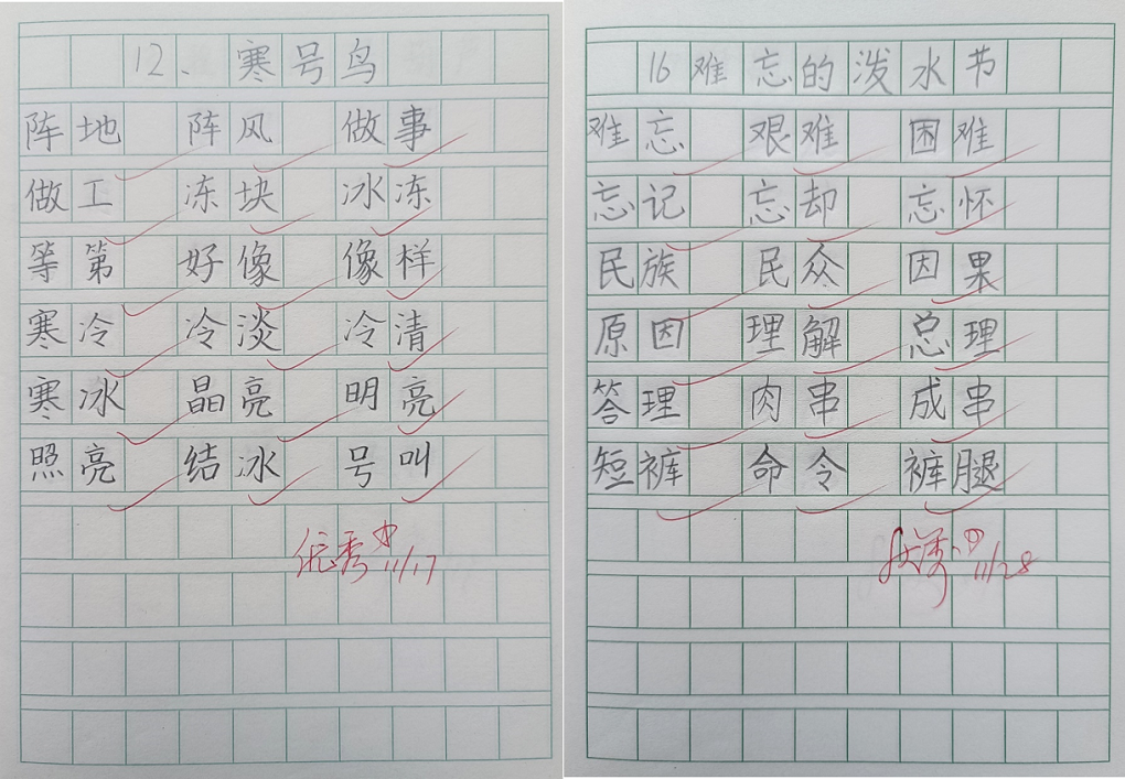 经过一年多的系统性训练,班级写字教学成效显著。学生作业的卷面整洁度整体提升,笔画书写更有力度和节奏,结构安排逐渐趋向平稳、匀称、美观,涌现出一批结构合理、笔画清晰漂亮的优秀作业。从而让传统文化的光彩,在一笔一画的认真描绘中,浸润着每个孩子的心田。