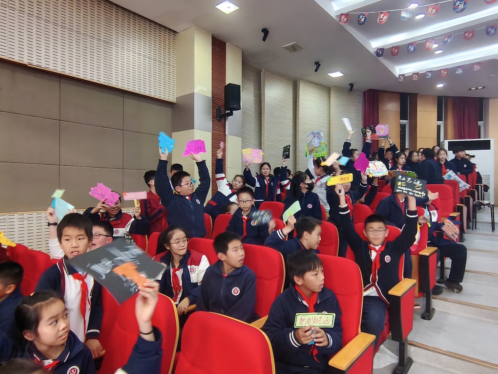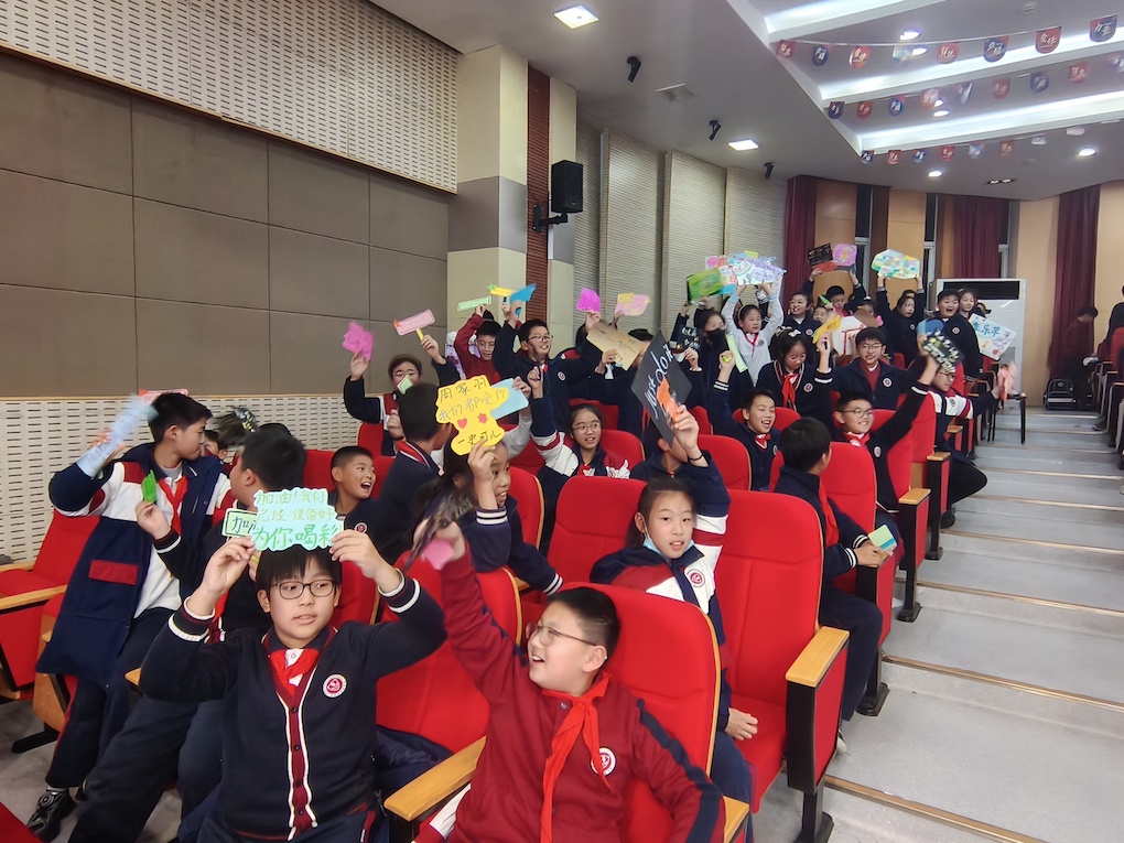 终选当天,五(2)班的同学们化身最给力的 “后援团”。当周家羽、赵艺涵依次登台演讲时,台下的同学们整齐举起加油卡和手牌,用洪亮而整齐的声音喊出加油标语,掌声与欢呼声此起彼伏,成为现场最动人的风景线。