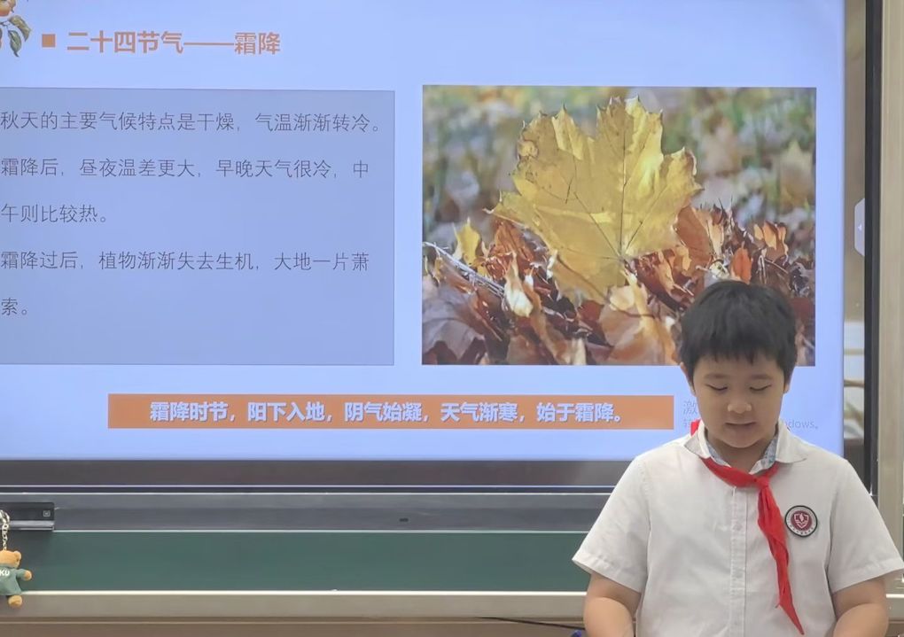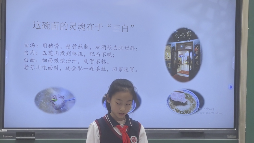 自主探学阶段,学生按节气分组,每组负责3至4个节气的饮食文化探究。大家主动走进图书馆翻阅苏州饮食典籍,寻访长辈记录民间美食故事,深挖青团、馄饨、重阳糕等节气美食的由来与制作技艺。从梳理“冬至吃汤圆”“清明吃青团”的民俗内涵,到整理各类美食的古法制作步骤,学生们全程自主搜集、筛选、整理资料,将探究成果转化为PPT与图文素材,通过“小小讲师”分享会轮流登台讲解,在自主表达与交流中,深化对姑苏节气饮食文化的理解。