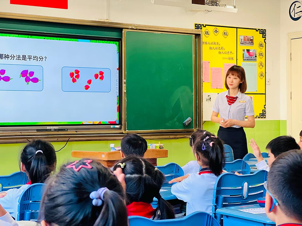 朱主任在小学AC二(5)班听刘老师给孩子们上了一节生动有趣的数学课《平均分》,朱主任也深入课堂,与孩子们进一步交流,孩子们听得意犹未尽。