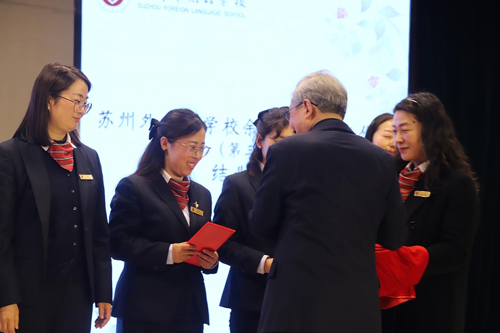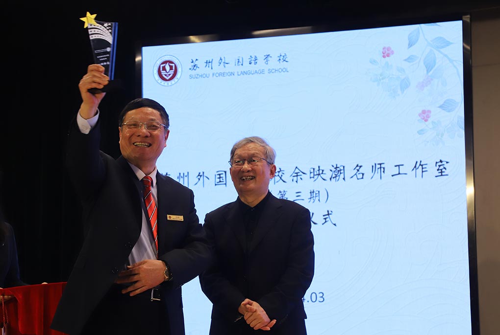 第三期工作室成员的结业仪式上,刘校发言致辞,表达了对余老的感谢,同时也代表我校向余老颁发了苏外学术委员会终身顾问的聘书与奖杯。余老师亲切致辞,希冀我们所有语文老师都能孜孜不辍,成为闪闪发光的语文人!