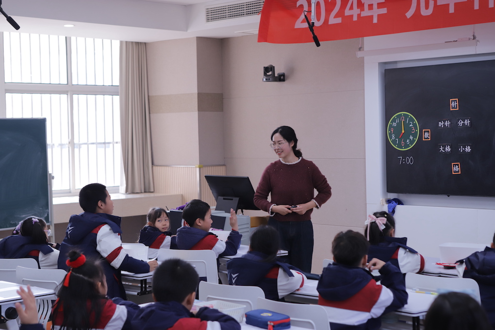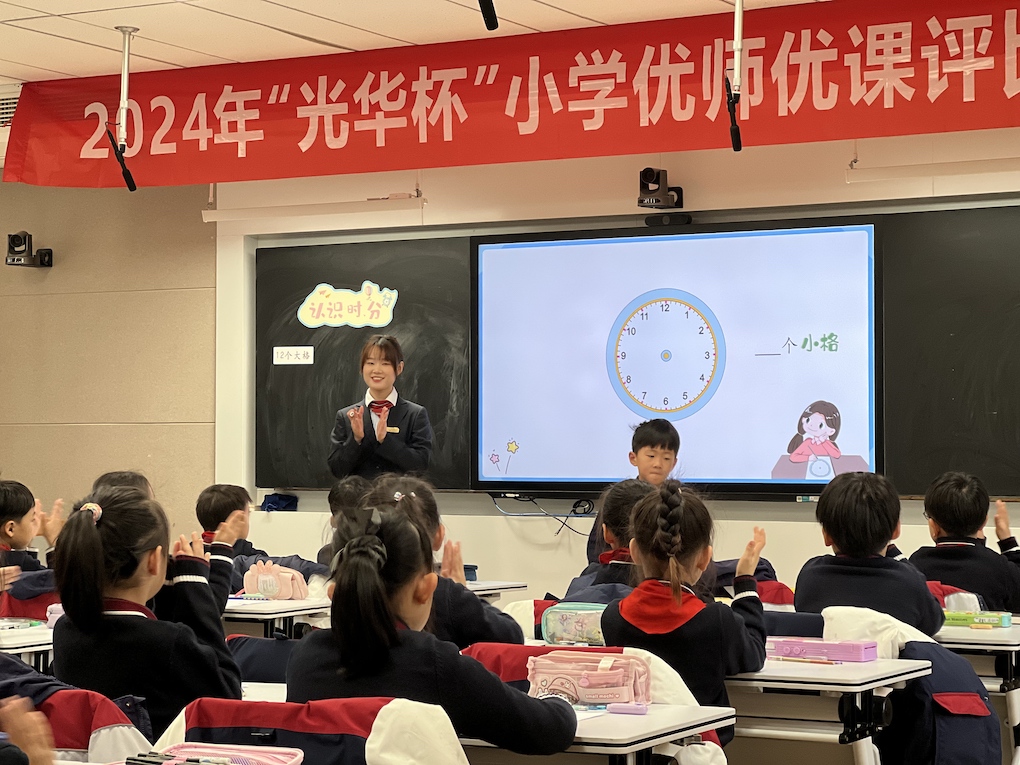 苏外孔凡楚老师的《认识时分》,课堂灵动有佳,以“小新同学的一天”贯穿始终,学生自己画钟面,拨钟面,自主探究时针和分针的转动,润物细无声地让学生认识了钟面、学会了辨别时间,了解小时和分钟的关系。孔老师落落大方、极具亲和力的教态也让师生配合更加默契。常熟校区的陆佳仪老师,由听闹钟和指针转动的声音引出课题。把认识时间与生活相结合,探索时和分的关系,在活动中体会一分钟有多长。大港校区的吴悦老师,通过视频了解古代人怎样计时和时钟的作用引出课题。教学内容环环相扣,结合同桌交流,小组讨论等多种方式探究学习。教学内容由易到难,层层深入。