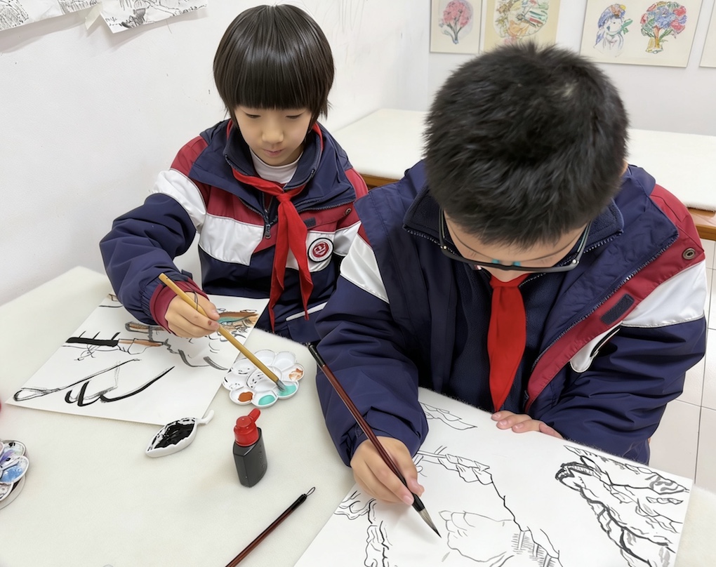 另外 3 节传统临摹课 ——《儿时的玩具》、《秋之韵》、《山水小写意》,则是孩子们夯实基础的 “练兵场”。考虑到大家都是零基础,老师从最基本的握笔、运笔教起,手把手示范中锋、侧锋怎么用,耐心讲解 “焦、浓、重、淡、清” 五色墨怎么调,还有山水里简单的皴法技巧。孩子们睁着好奇的眼睛,认真观察着优秀的传统画作,一笔一画地临摹、练习。从一开始握笔紧张得手抖,墨汁要么太浓糊成一团,要么太淡看不清痕迹,到后来能稳稳地勾勒线条,灵活调配传统色彩渲染画面,孩子们的进步就藏在这日复一日的练习里,清晰又动人。