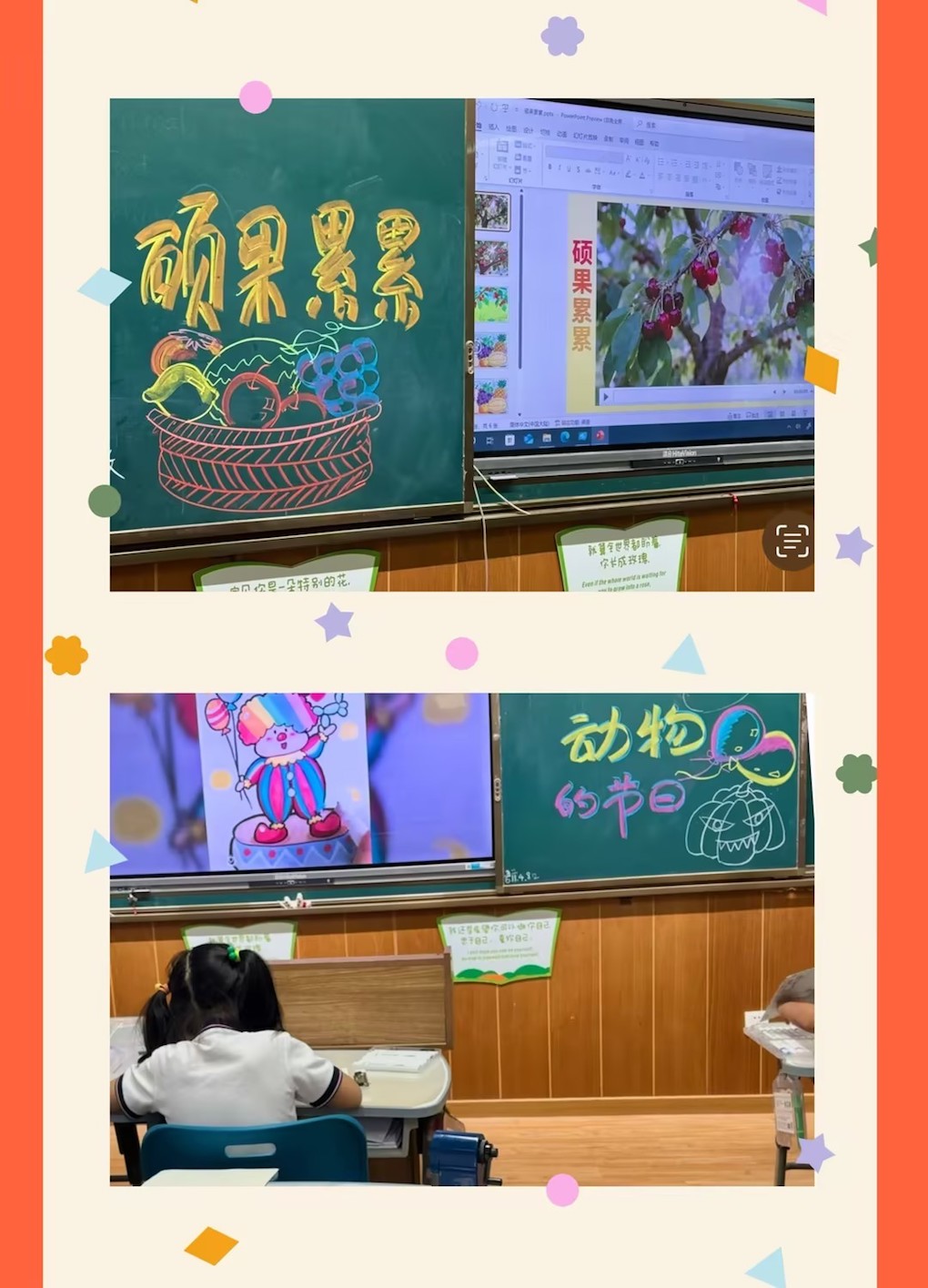 课堂上,“硕果累累”“动物的节日”等主题化作灵感源泉,黑板上的童趣板书、屏幕里的创作素材,让孩子们在具象的主题里探索线条与色彩的奥秘。从最初对线条的生涩勾勒,到如今能大胆用斑斓色彩铺陈画面,孩子们的笔触越来越灵动,不管是充满想象力的动物主题创作,还是融入巧思的节日画作,都藏着独属于他们的童真与创意。