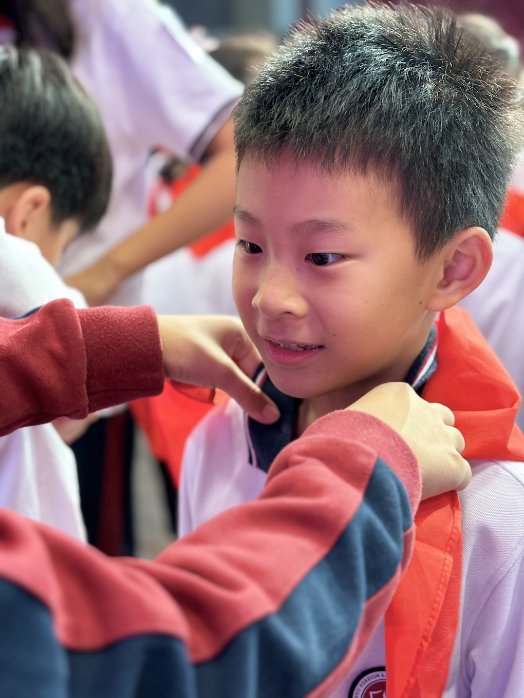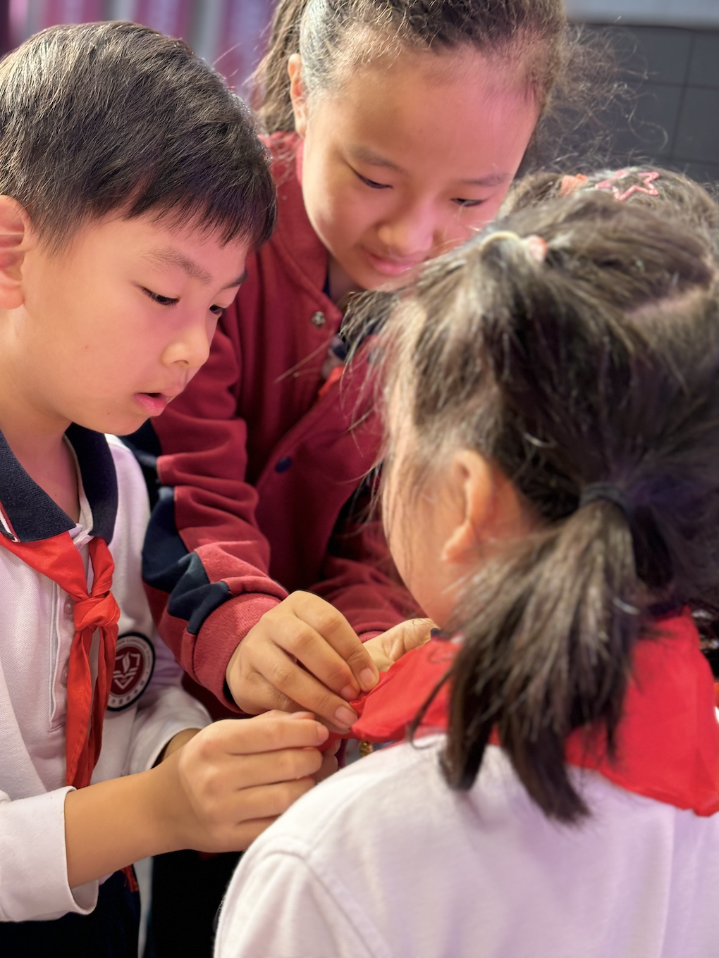 星星火炬,代代相传。小小少先队员们亲手为二年级同学戴上鲜艳的红领巾,并指导新少年队员们行队礼。戴上了红领巾的新队员们个个神采奕奕,精神饱满,嘹亮的少先队队歌响彻云霄。他们在火红的队旗下骄傲地挺起胸、握紧拳,跟着大队长庄严地宣誓。“准备着为共产主义事业而奋斗!”,铿锵有力的呼号响彻校园的上空,那一张张坚定的脸庞在红领巾的映衬下显得更加娇艳、更加灿烂!