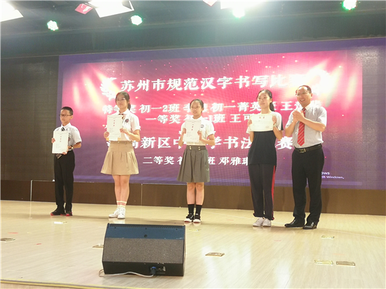 由蒋洁玉老师颁发多语种奖项,徐余忠主任颁发苏州市规范字书写比赛特等一等奖,李瑞主任颁发优秀个人单项奖。