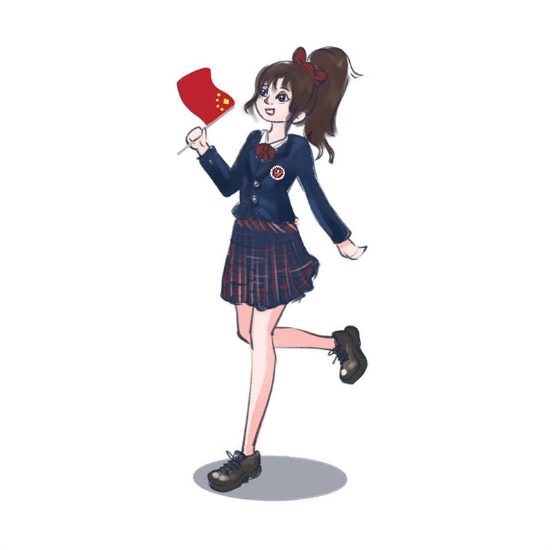 女孩身着衬衫和苏外红的格子裙,以领花作为点缀,双臂伸展,落落大方,同男生一样竖起大拇指,遥相呼应。眉眼柔和,散发着智慧之光;发色橙红,体现出苏外人的温暖、热情;发丝飘逸,展现出青春的风采飞扬。