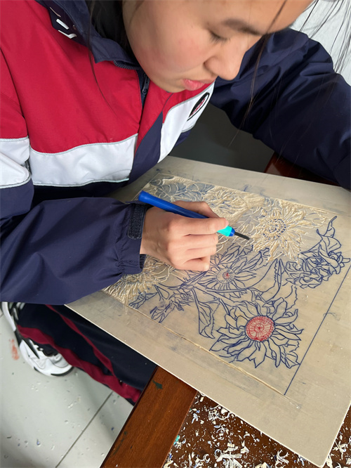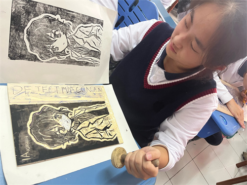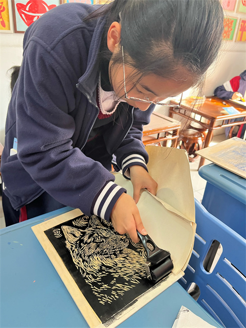 版涂印社社团以弘扬中国优秀传统文化为宗旨,基于版画艺术传承的美育课程而开设。木刻版画是绘画艺术的种类之一 。木刻是在木板上用刀刻出反向图像,再印在纸上欣赏的一种版画艺术。版画是指通过制版印刷所获得的印刷物。本学期让学生了解、掌握木刻版画制作方法。通过对版画底稿进行设计,再印制到椴木板上使用刻刀进行划刻,最后使用油墨拓印成画。这些学习过程中孩子们付出了很多的心血和精力,才完成出这一张张出色的作品,他们也有了更多的认识和体验。