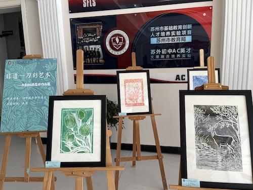 一刀一刻蕴华章,一版一印画千万。木刻版画是一门集绘画、刻板、印刷为一体的综合性绘画艺术,是在木板上采用不同的刻刀,通过刻、切、铲、凿、划等手段来表现形象的传统技艺。走进苏州外国语学校静谧的版涂印社社团,感觉一切都安静了下来,只有刻刀在木板上留下印记的声音,缓缓卷起掉落木屑的声音,同学们用心雕刻着一幅幅作品,感受着这源自千年前的传统手工艺,就在这精心雕刻间,入木三分,一幅幅画面被定格成永恒。