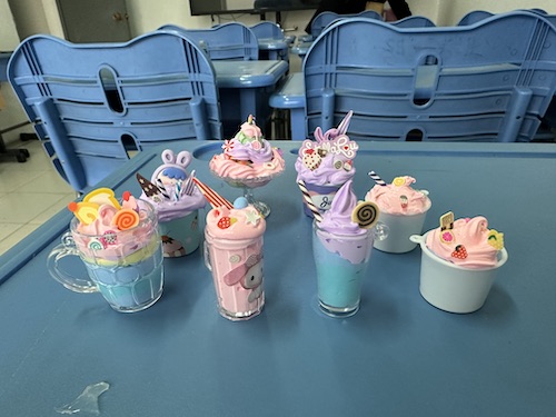 除了这些非遗作品外,本学期同学们还制作了袖珍且逼真的奶油胶甜品,柔软且充满温度的毛线戳戳秀,充满春日风情的手编菜篮子。
