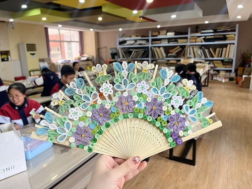在指导老师的悉心指导下,成员们从设计草图开始,经过反复讨论和修改,最终确定了折扇的样式和色彩搭配。他们精心挑选纸张,耐心地卷制每一片衍纸,再将它们巧妙地拼贴装饰扇面。每一把折扇都凝聚了两位成员的心血和创意,展现了他们对衍纸艺术的热爱和对传统文化的尊重。
