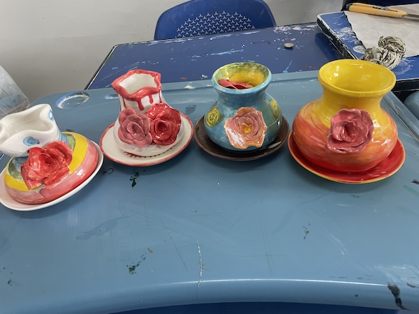 拉坯课程中,同学们手法愈发娴熟,制作的花瓶底托、双层花瓶、猫碗等作品,比上学期更加精致。捏雕课则创意纷呈——月牙笔筒、翡翠白菜、金针菇盘子、西瓜商店,每一件作品都充满奇思妙想。