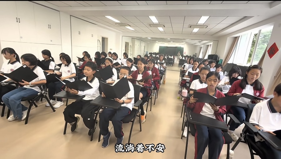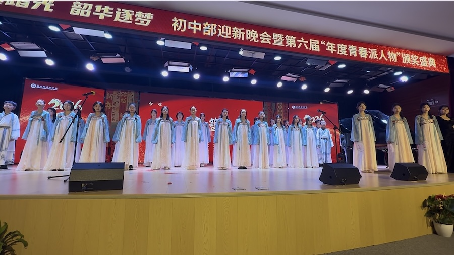 舞台之上,新团员们更是展现出蓬勃向上的精神风貌。在学期末的云端汇报演出中,他们与老团员默契配合,以清澈嘹亮的嗓音、整齐划一的节奏和真挚饱满的情感,演绎了多首经典曲目。镜头前,他们衣着整齐、精神昂扬,眼神中闪烁着对音乐的热爱与自信;旋律里,他们的歌声与各声部完美融合,勾勒出和谐动人的听觉画卷,赢得了师生与家长的一致好评。这份亮眼的表现,不仅是对一学期刻苦训练的最好回报,更彰显了苏外学子德智体美劳全面发展的良好素养。