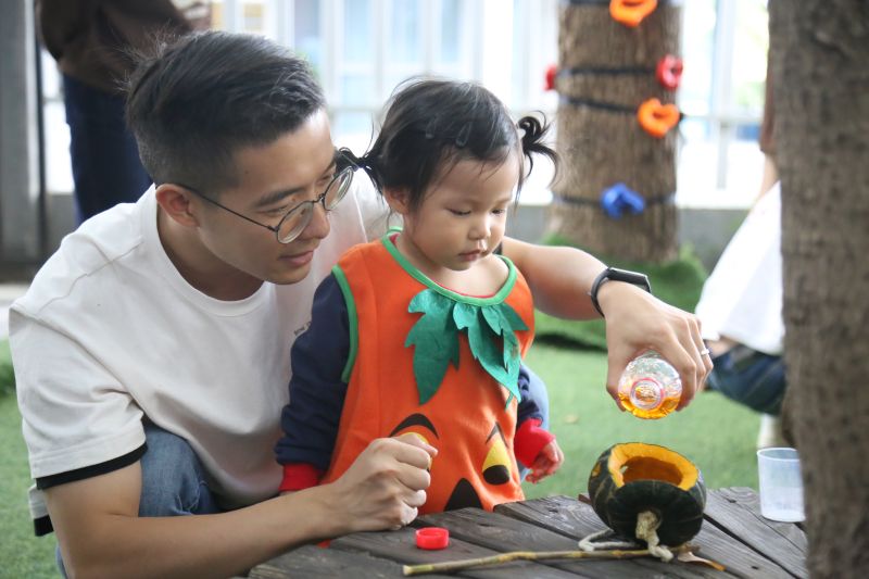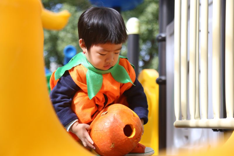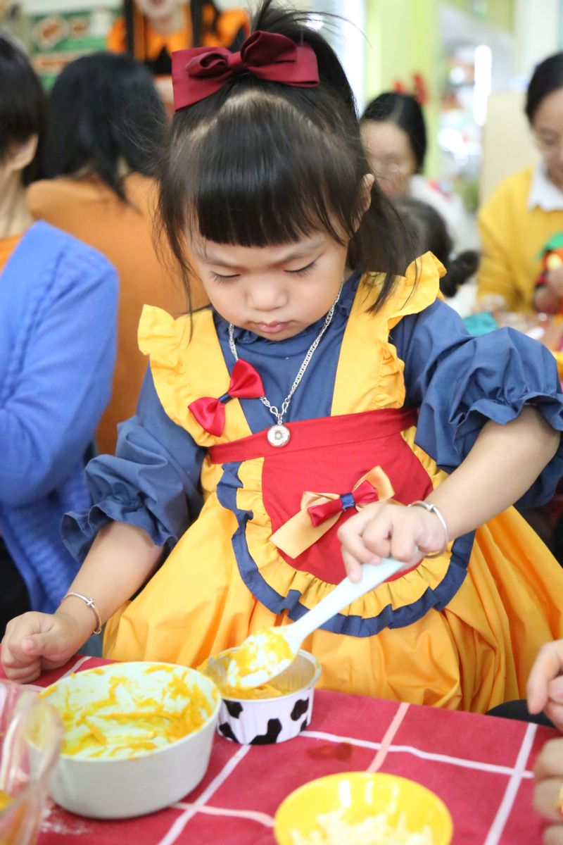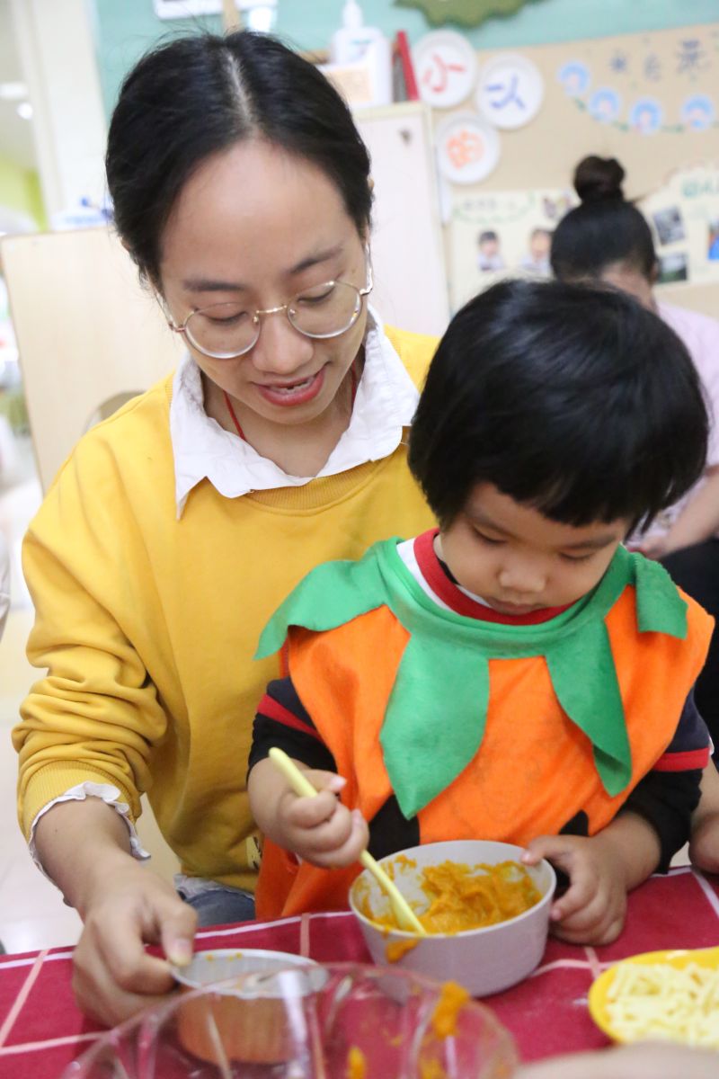 听完了南瓜和动物朋友们的故事,小朋友们准备变身美味烘焙师,制作香喷喷的芝士焗南瓜。看我拿起勺子上下翻滚搅拌,调制南瓜泥。小手捏捏,撒上拉丝的芝士奶酪,放进烤箱,等待美味甜点出炉!