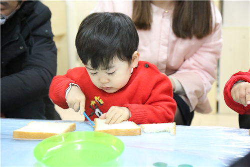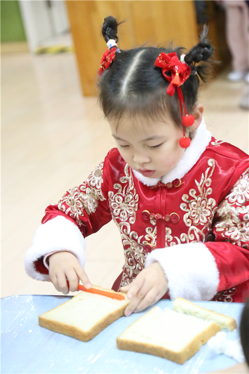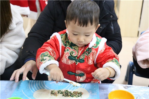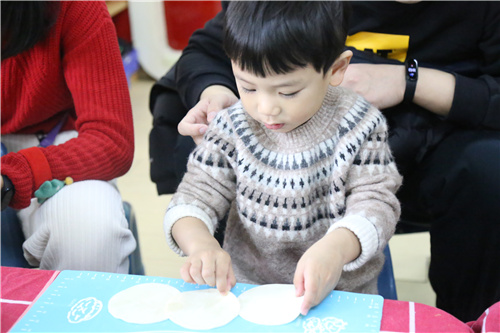 热身结束,宝贝们转战烘焙教室变身“大厨”,挑战新年美味点心——笑口常开包饺子,虎虎生威烤吐司、好运连连棉花糖: