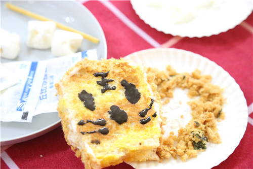 正方形的吐司,经过宝贝们的切割,变成了一个个小小的方块。叠上香香的芝士片,抹上甜甜的沙拉酱和鸡蛋液,送进烤箱里高温烘烤。香喷喷的吐司出炉了,宝贝们拿巧克力当画笔,画出一个虎头虎脑的小老虎,好吃又好玩!