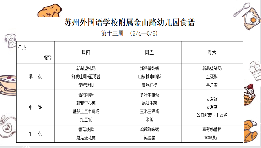 苏外附属幼儿园第十三周食谱