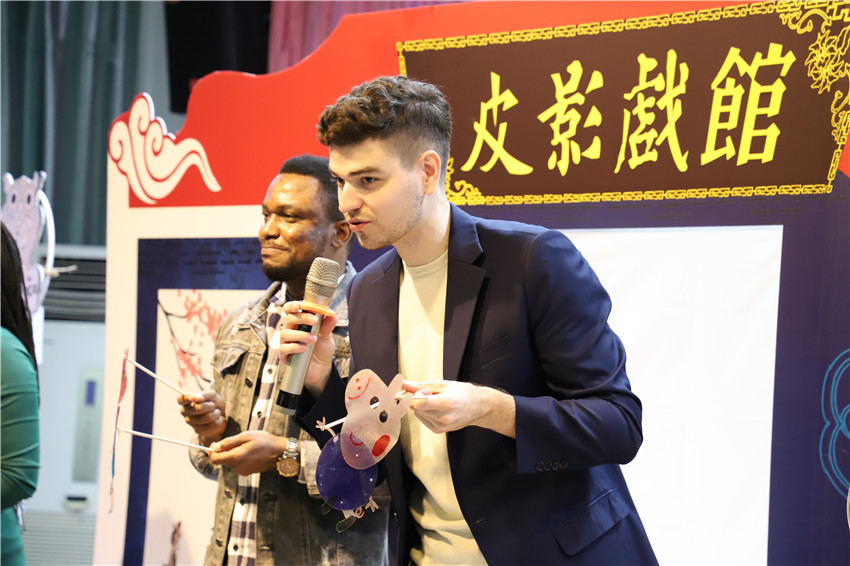 戏台搭好,好戏上演了。主持人热情开场之后,外教们转战幕后,开始正式演出。灯光掩映下,手指灵活的外教们操纵着皮影,白色幕布上精致漂亮的小皮影们似乎有了灵魂,灵动地穿梭在白色幕布上。