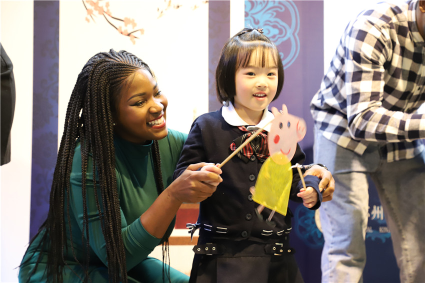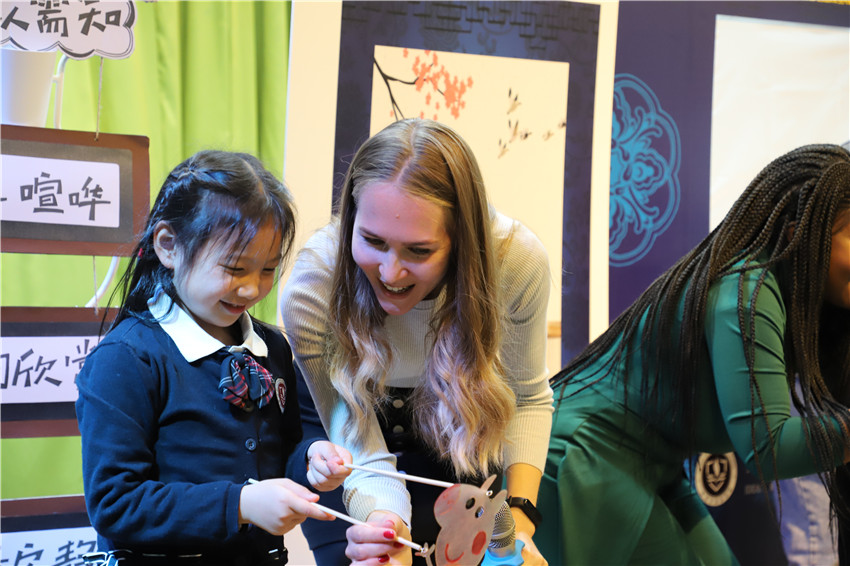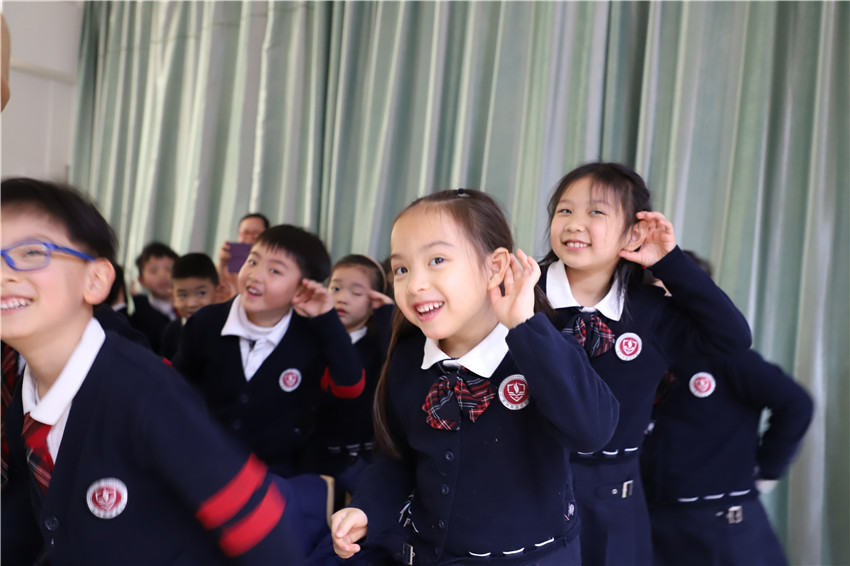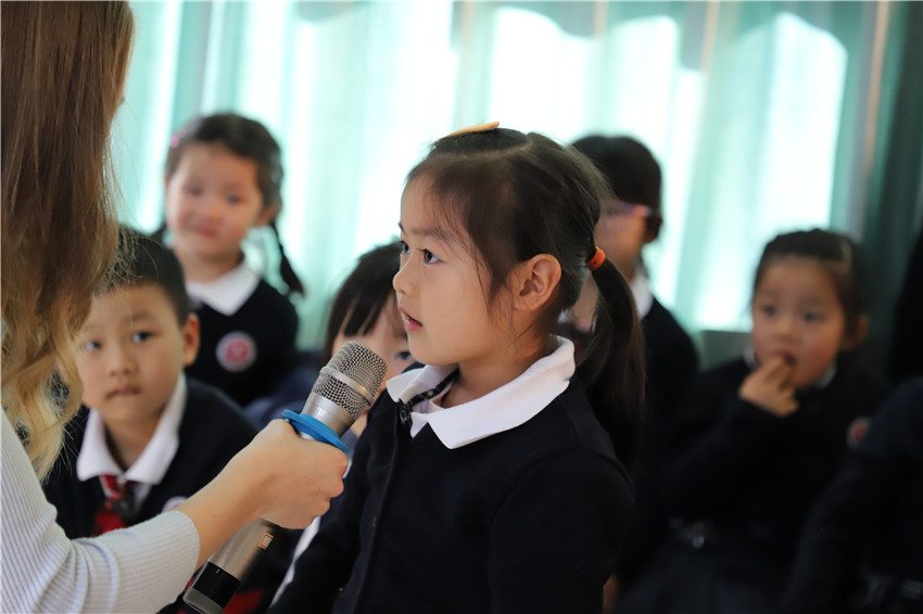 在“Peppa’s Party”的音乐律动中,孩子们与外教一起延续着刚刚皮影戏里的故事情节,舞台被孩子们团团围住,现场气氛异常热烈。