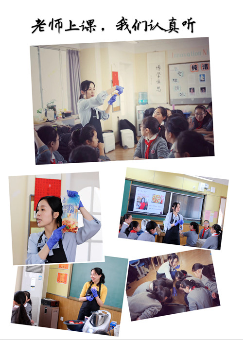 今天宦老师为我们安排了一节烹饪课,你知道的,我们最爱烹饪课,又能做,又能吃,真是一举两得。(张芯睿)今天来为我们上课的是陈婷老师,她从事烘培分享课程3年,任职于德国福维克单位美食顾问,曾录制《宝贝厨房》和《生活6点档》,拥有自己的烘培工作室,开设成人烘培分享课程以及学校的烘培兴趣课程。另外同来的还有一名吴皛老师,同样是烹饪专业老师。