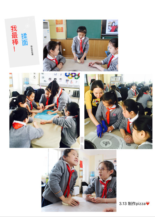 我们这个小组,简直要把这个面团当成自己的掌上明珠了,只要有什么东西粘上去,就大叫起来,生怕它被弄脏。终于我们把面团揉得很软了,但是我们的脸却像一个个已经熟透了的大苹果,在等面团发酵的宝贵30分钟里,我们趁机做了披萨酱,又学了一招。——蔡紫韵