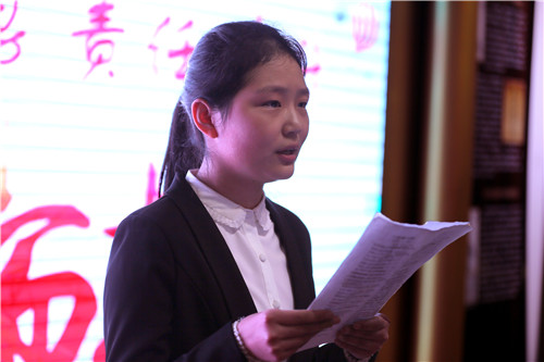 全体肃立,奏唱国歌,行注目礼。在集体朗诵诗歌--“青春奋斗之歌”的豪迈声中,我们感受到了苏外学子的成长、成熟与担当。张玥尔的母亲范振英女士作为家长代表,做了意味深长的发言,款款深情,诠释了父母对孩子的爱。然后,学生代表杨雪凡、詹绍基、陈天赐、苏奕铭四位同学从青春、成长、感恩、责任四个方面做了精彩发言,赢得阵阵掌声。