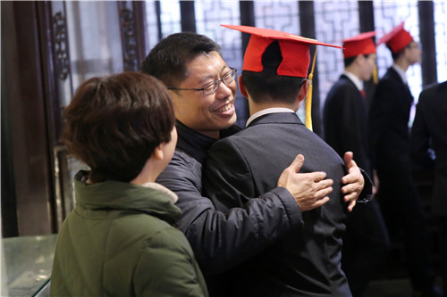 高三学子们手捧宪法,庄严地走上红毯,走过“成人门”,90°叩拜父母——感谢养育之恩,90°叩拜老师——感谢教育之恩,90°叩拜同学——感谢陪伴成长、相互学习、相互帮助之恩。董彬校长亲自为每一位学生戴上成人帽,任课教师细心为学生整理流苏,老师和学生握手拥抱;每位家长也给自己的孩子送上精心挑选的礼品,与孩子紧紧拥抱在一起。很多学生主动和父母师长合影留念,记住这感人、神圣而永恒的一刻。
