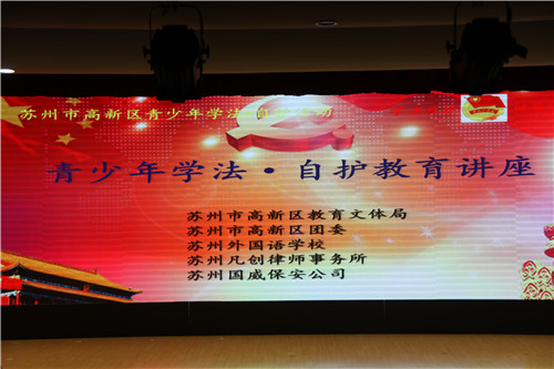 由苏州高新区团委、高新区教育局和虎丘区法院联合举办的“普法说凡音,青年创未来”青少年“学法·自护”活动在苏州外国语学校六楼报告厅举行。校团委组织我校初一年级的同学参加了本次活动。