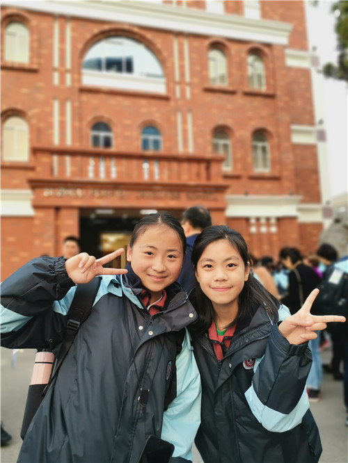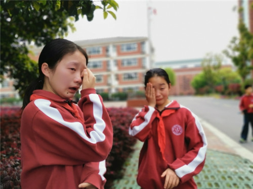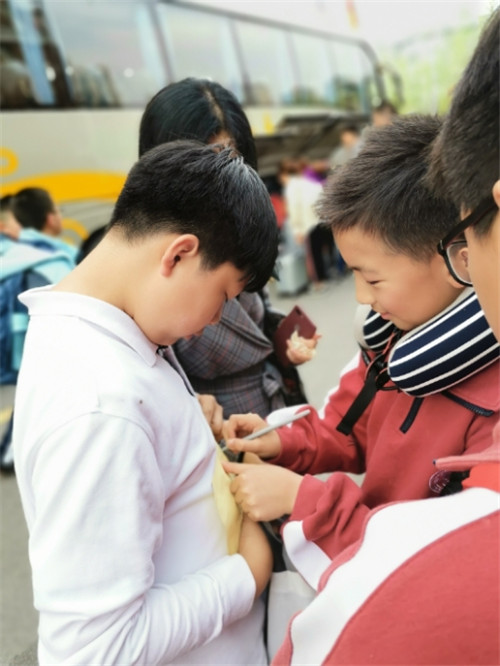 前来送行的人群中,昔日的同窗好友是最不会掩饰自己情感的。六(2)班的一群男生围着赴英的同学开心地聊着,满脸的羡慕,又似乎在交代他们可别忘了这些相处了六年的好伙伴。平日里爱调皮捣蛋的石恩佳同学也展示了自己柔情的一面,匆匆找来纸和笔,以自己的胸口为桌面,让远行的同学赶紧留下联系方式,生怕以后再也联系不上。最多情的还是六(2)班的一群女生了,看着同伴们即将远行,想到等他们回国大家已经小学毕业,各奔东西,或许难得见上一面了,再也抑制不住内心的不舍,任那泪水流淌下来。