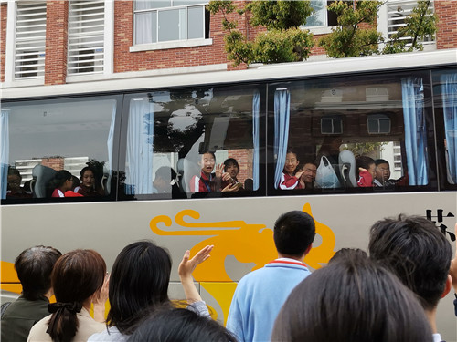 4月12日下午1点,苏外北门广场簇拥着一大群人,这是赴英国修学的七十多位六年级同学即将启程。这些同学和带队老师将乘车前往上海浦东国际机场,将飞行9000多千米前往英国伦敦,完成历时三个月的出境修学访问课程。学校领导、班主任老师和班里的同学们都纷纷前来为他们送行。