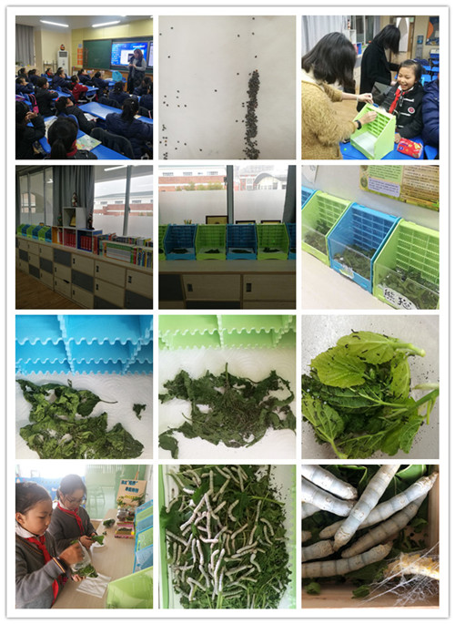 为了让孩子们能够科学合理地孵化、喂养蚕宝宝,义工妈妈一起上网购买了蚕宝宝别墅,制作了蚕宝宝知识小报,到班级给孩子们举办养蚕讲座。在义工妈妈的协助下,全班同学被分成了六个养蚕小组,组长负责把蚕卵带回家孵化。每组负责一个蚕别墅,把已经孵化出来的蚁蚕分到六个别墅里,由小组成员轮流负责照顾。每天带新鲜的桑叶,擦干桑叶上的露水,剪成细丝,再喂给蚕宝宝吃,还要定期到给蚕宝宝更换蚕沙。