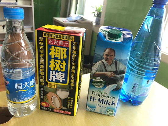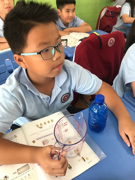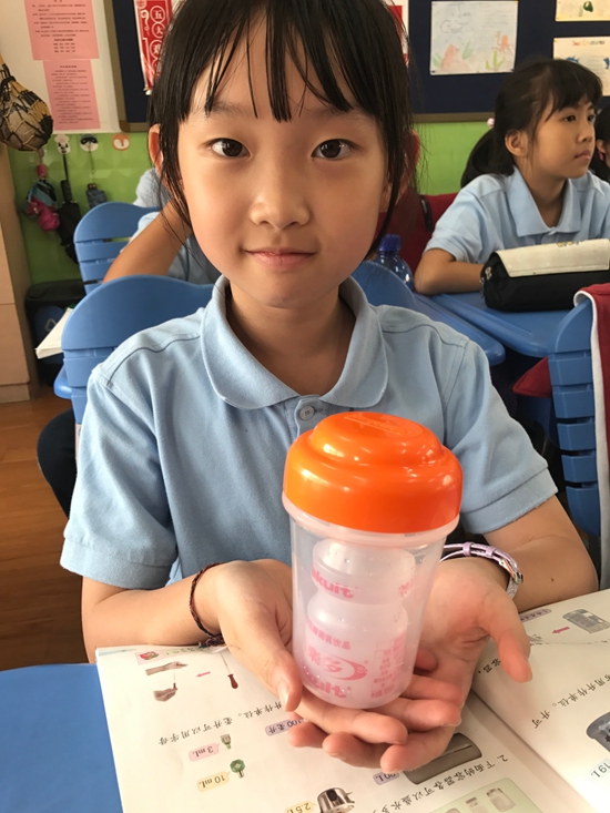 朱老师首先让我们看那两个装满水的小瓶子,上面写着都是500毫升,接着又让我们用尺子量了那个立方体容器的长宽高,都是1分米,朱老师告诉我们这是个正方体。然后朱老师让我们猜这两瓶500毫升的水能否装满那个边长为1分米的正方体,有的同学说可以,有的同学说不可以,教室里分成了两派,争论的面红耳赤。朱老师笑眯眯地让我们安静下来,开始把两个杯子的水倒入立方体中。哇,正正好好,那两个瓶子空了,容量为1立方分米的正方体也正好装满。我们说可以装满的同学欢呼起来,朱老师又告诉我们这1立方分米的正方体正好装了1000毫升的水,而1000毫升等于1升,也就是说1升等于1立方分米的容量,我们恍然大悟,觉得数学的计量单位好神奇呀!