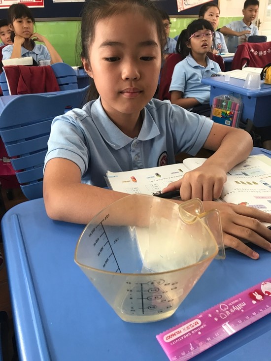 接下来朱老师又让我们猜这1升水能倒满多少个纸杯。我们又开始叽叽喳喳地议论起来,有的同学说3个,有的说4个,还有的同学说5个。朱老师又笑盈盈地开始往水杯里倒水,教室里立刻安静下来,大家都屏住呼吸,似乎连根针掉在地上都能听见,静静地看着到底能装满几杯,最后当倒完第四杯水时,立方体里的水没有了,猜中的同学鼓起掌来。朱老师又问我们:“如果这1升水只能装满两个杯子,说明了什么?”我们马上齐声回答:“说明杯子比较大!”朱老师又问:“如果能装满5个杯子,又说明了什么呢?”我们又异口同声地说:“说明杯子比较小!”这时下课铃声响了起来,大家似乎都意犹未尽,全都沉醉在有趣的数学世界里,好像都没听见铃声,这时朱老师说:“好了,同学们,喜不喜欢这样的数学实验课呀?”我们不假思索地齐声说:“喜欢!”然后朱老师和同学们都笑起来,在欢声笑语中我们结束了这堂有趣的数学课!