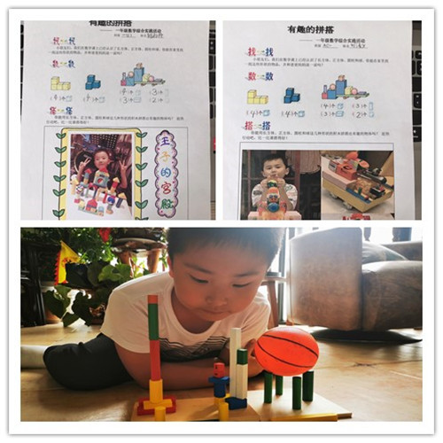 为了让低年级学生在看、摸、认、拼、搭等操作活动中,加深对立体图形特征的认识与理解,获得对简单几何体的直观体验,一年级数学组开展了《有趣的拼搭》综合实践活动。这是学生进入小学后首次接触几何图形,教学内容和要求是直观认识长方体、正方体、圆柱与球,让学生们知道这些几何形体的名称,了解生活中有许多这些形状的物体,并能把看到的实物与相应的几何形体联系起来,用几何形体的名称描述实物的形状。为了让学生牢固正确地建立这几种形体的表象,形成初步的空间观念,我们设计了以下实践活动。