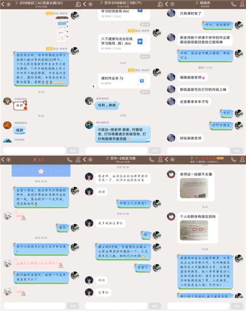 初一初二数学组众志成城,分工明确,有的老师负责备课把关和作业审核,有的老师将负责课程直播;七年级语文备课组的四位老师虽然远在四个不同的城市,但一个WIFI信号、一个QQ通讯把四个人的心连在了一起;初二物理组通过笔记展示与错题整理的形式,帮助班级形成良好的物理研讨氛围;生物组老师将此次疫情与课本中传染病和免疫系统的相关内容整合,设计导学案,帮助同学们科学系统将理论知识与现实中的传染病防控联系起来......
