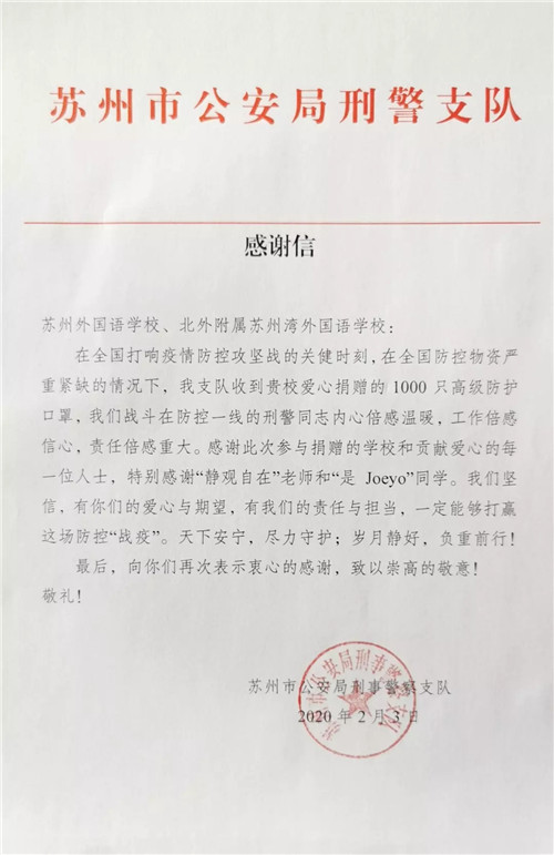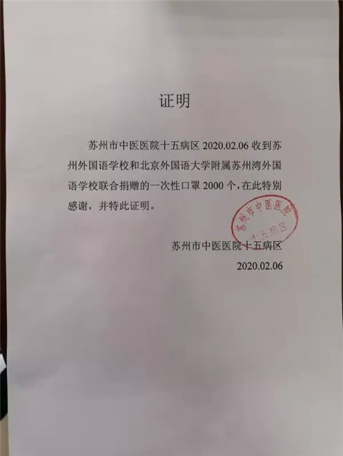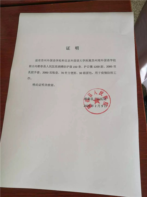 日前,苏州外国语学校师生自发组织募捐和物资捐助活动,苏州小火柴爱心团队、苏州树莓派(含苏州中学、苏州领科教育学校等)、北外附属苏州湾外国语学校、武汉英中高级中学等纷纷加入,以实际行动支援前线。目前,募捐行动已于1月31晚截止,共募得资金261000.82元,目前已支出259644.98元。