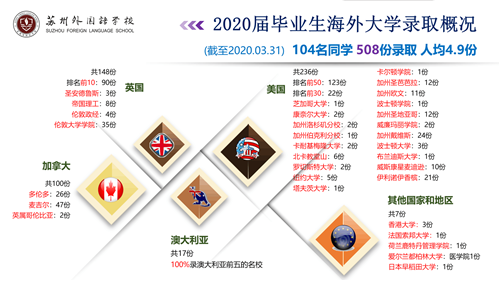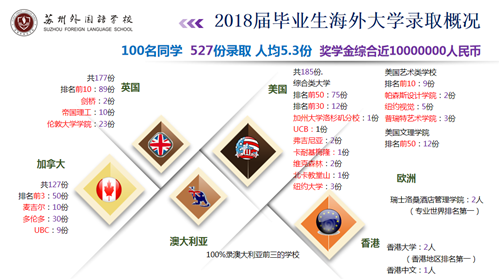 截止2020年3月30日,苏外2017级国际高中学子已经收到世界各国名校录取502份,包括全美TOP6芝加哥大学,著名常春藤盟校康奈尔大学(2份),全美前TOP30加州大学洛杉矶分校(2份),加州大学伯克利分校,南加州大学,卡纳基梅隆大学(2份),塔夫茨大学,纽约大学(5份),罗切斯特大学(2份),著名美国文理学院卡尔顿学院;英国G5名校帝国理工学院(8份),伦敦大学学院(31份),英国排名第3圣安德鲁斯大学(3份),伦敦政经学院(4份);加拿大排名第一多伦多大学(26份),排名第2麦吉尔大学(47份);澳洲TOP2名校墨尔本大学(9份);荷兰鹿特丹管理学院;爱尔兰排名第一的都柏林大学(医学院本科专业)等。录取不断更新中,敬请期待!