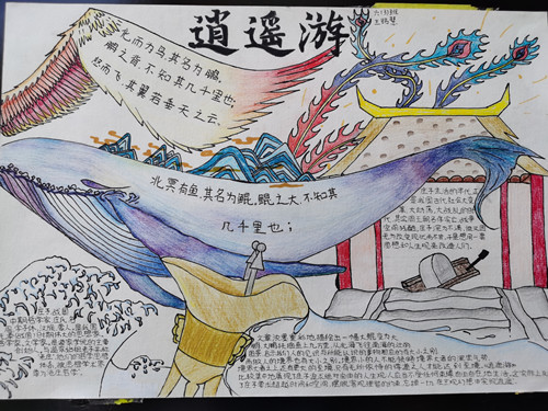 王铭慧同学则以庄子的《逍遥游》作为她小报创作的主题,构思新颖巧妙,充分表现了庄子道家思想的浪漫与逍遥。在构图方面小报的正中央是一条用彩铅绘制的鲲,正是表现出“北冥有鱼,其名为鲲,鲲之大,不知其几千里也”的雄奇怪诞。鲲的上方绘制了一双鹏鸟的翅膀,彩色的羽翼,给人以丰富的想象空间。在文字方面,小报不仅摘录了《逍遥游》中的片段,还对庄子以及作品的理解进行非常深入的阐释。