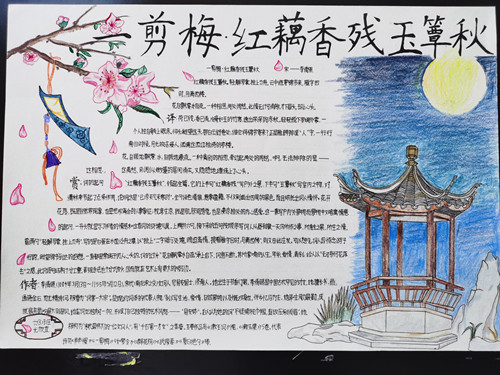 尤欣宜同学的小报是以李清照的词《一剪梅》为主题进行创作。左上角是一枝梅花和摇曳的风铃,几片花瓣被风吹得纷纷飘零,顿使画面有了动感。画的右侧是一座凉亭,空空荡荡;一轮残月高悬在夜空,孤孤寂寂,使画面充满了一种凄冷之感,十分贴合这首婉约词的主题:离别的相思无法排遣,从微蹙的眉间消失,又隐隐缠上了心头。