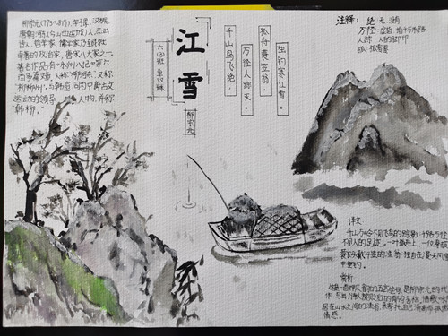 单双琳同学则对柳宗元的《江雪》尤其欣赏。她以黑白水墨画色调在纸上晕染勾勒出了“渔翁独钓”的画面,意境深远,充分体现了这首诗所表现的寂静清冷之感,更把柳宗元当时的孤独心境也表现得淋漓尽致。
