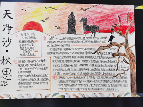 朱茗一同学对马致远的小曲《天净沙 秋思》颇感兴趣。她首先在画纸上勾勒出一幅夕阳西下图景,再描绘了一个牵着瘦马的天涯旅人的背影,这样的画面将“秋思”中的因思乡而断肠的“游子”形象表现得意蕴悠长。而配上全曲的内容,“枯藤老树昏鸦,小桥流水人家,古道西风瘦马,夕阳西下,断肠人在天涯。”画面如此生动,意境如此深远!