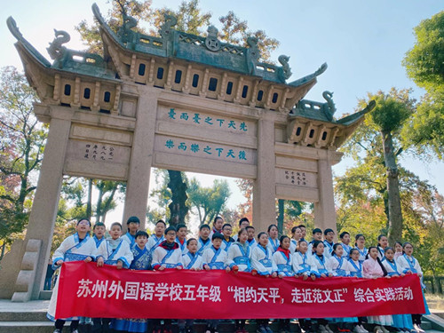 尚友古人,得其智慧是我们学习国学经典最现实的意义。“书本不是孩子的世界,世界才是孩子的书本”。天平山,著名文学家范仲淹的先祖安葬在这里。人们为了纪念范仲淹,在天平山修建了范参议公祠堂,范公的“先天下之忧而忧,后天下之乐而乐”的高义,犹如猎猎旗帜,激励人们开阔胸襟。12月份五6班全体师生走进天平山进行研学,在天平山牌坊前师生还自发集体诵读了范仲淹的《岳阳楼记》,与圣贤共鸣,徜徉在红枫绿茵间,畅游在历史长河中……同学们学到了许多古代文化与古代传承的精神,激发了爱国主义情感,珍惜当下来之不易的幸福生活,努力学习、健康成长,为祖国更加强盛而努力!