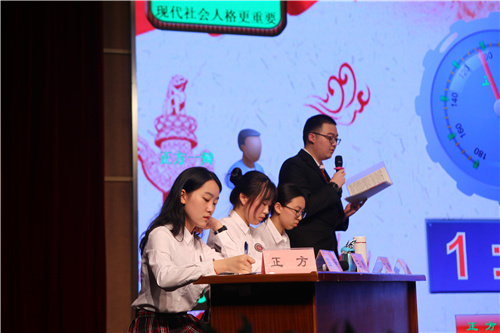 其中一场辩题为“现代社会,人格/人缘更重要”。先是正方高二(3)班和反方高二(1)班一辩就己方观点理性破题立论。正方指出健全的人格是人们立足于社会的基本,而反方则从人与社会的联系切入,认为我们需要主动融入集体,集体也需要我们的加入。
