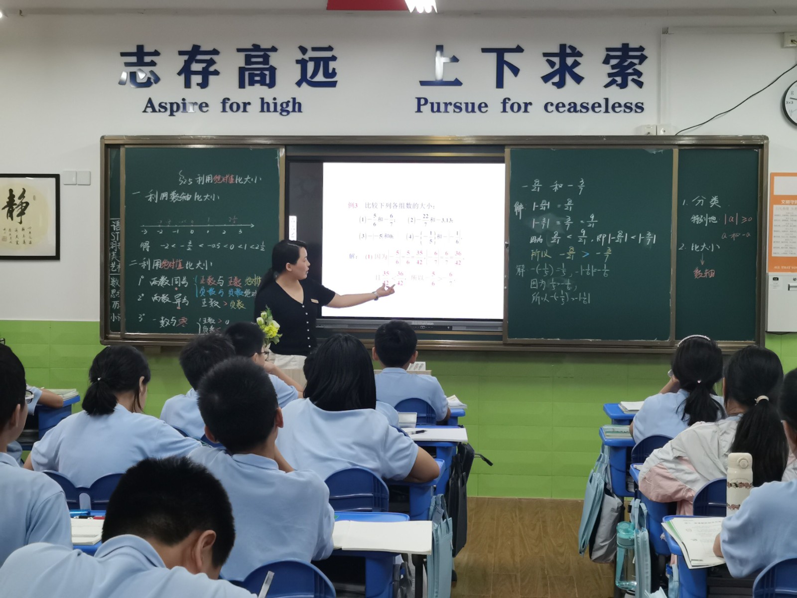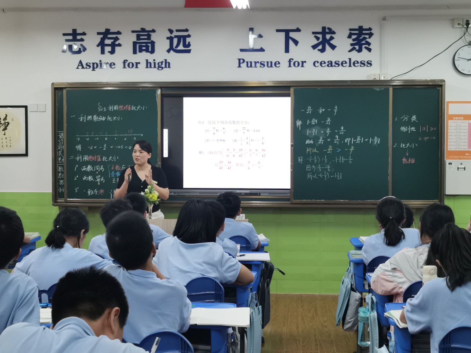 2021年9月8日下午,苏外初一年级数学组组织了教研活动,本次开课教师是初一AC2班何老师,何老师的《2.4利用绝对值比较数的大小》一课,从已知引出未知,利用数形结合的方式引导学生主动思考并总结出本节课的重难点。何老师教学问题设置简明凝练,幽默风趣,教学内容层层递进而又环环相扣,深入浅出的讲解让学生既有学习的挑战性又能收获到成功的喜悦。不得不提是何老师的板书设计,语言精炼,清晰美观,并且还用不同的颜色标注出重点,帮助学生更好的做课堂笔记。