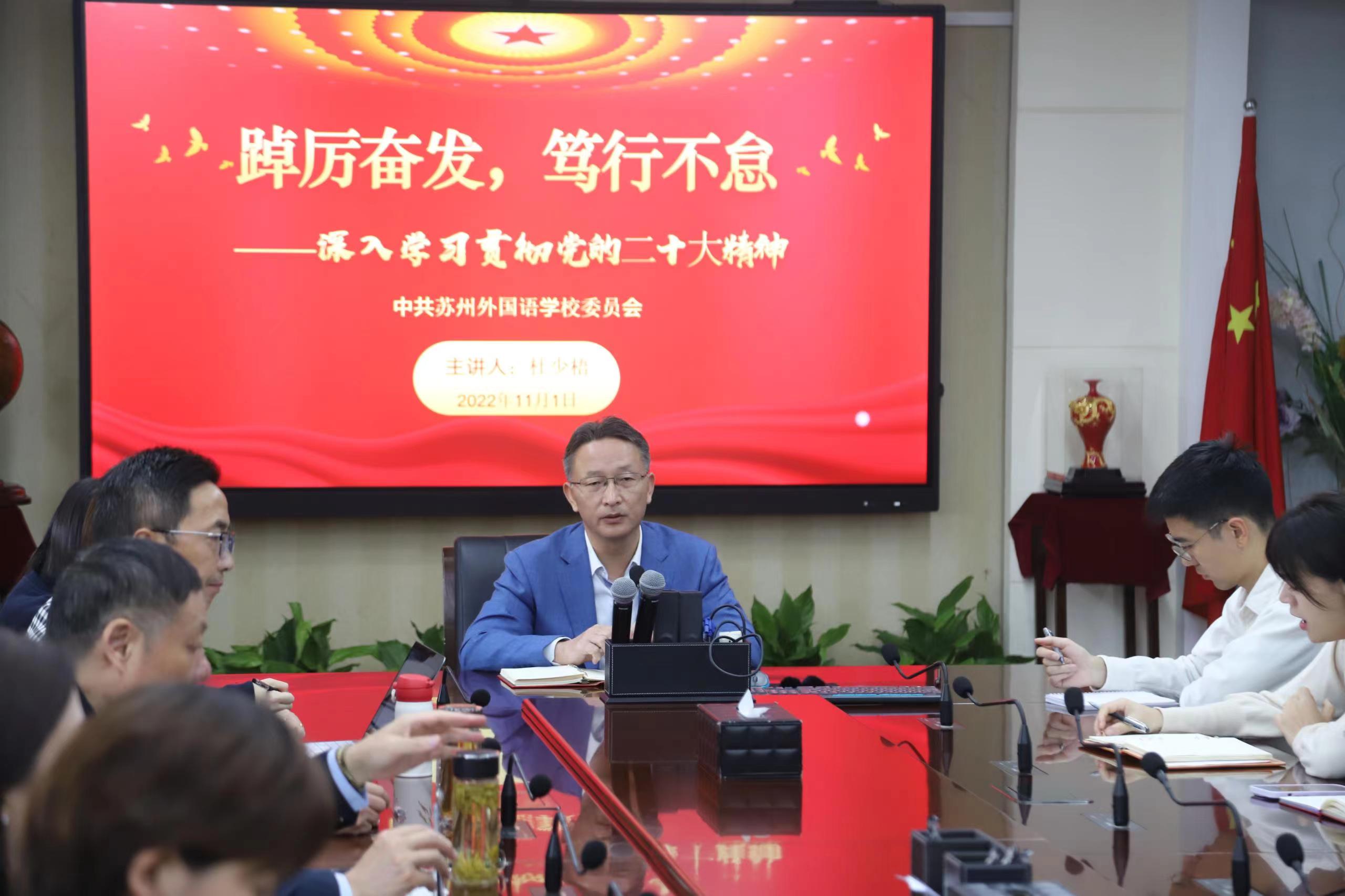 苏州外国语学校党委书记杜少梧作为老教师代表,向全体师生做了《自信自强、守正创新、奋进新征程》主题演讲,传递二十大精神。百年大计,教育为本。时代总是把历史责任赋予青年,青年强,则国家强。总书记在报告中说,“全党要把青年工作作为战略性工作来抓,用党的科学理论武装青年,用党的初心使命感召青年,做青年朋友的知心人、青年工作的热心人、青年群众的引路人。”杜校长指出,这彰显出党对青年的高度重视与殷切期盼。每位同学都要做到听党话、跟党走,将小我融入大我,将个人梦融入国家梦,将个人理想与国家民族命运结合起来。我们不单要注重自身发展,更要关注国家大局,明方向,立志向,在中华民族伟大复兴的征程中展现自我,贡献自我。